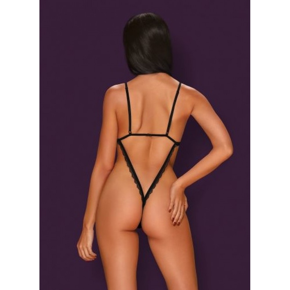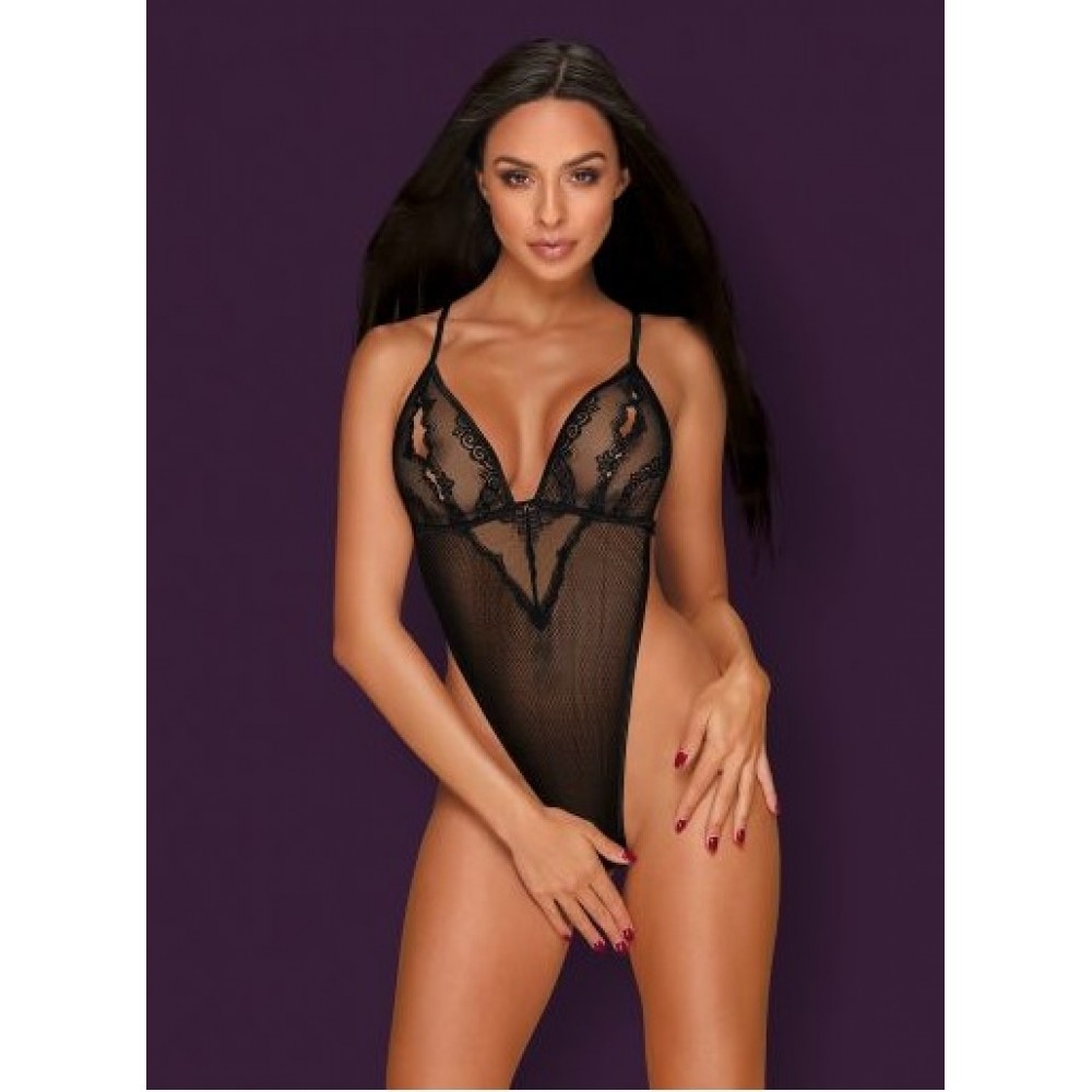 Vilinošs caurspīdīga auduma bodijs. Regulējamas plecu lencītes, šķēlumi uz krūtīm, seksīgas svītras uz muguras, atvērta kājstarpēe, maigs un elastīgs audums (90% poliamīds, 10% elastāns).