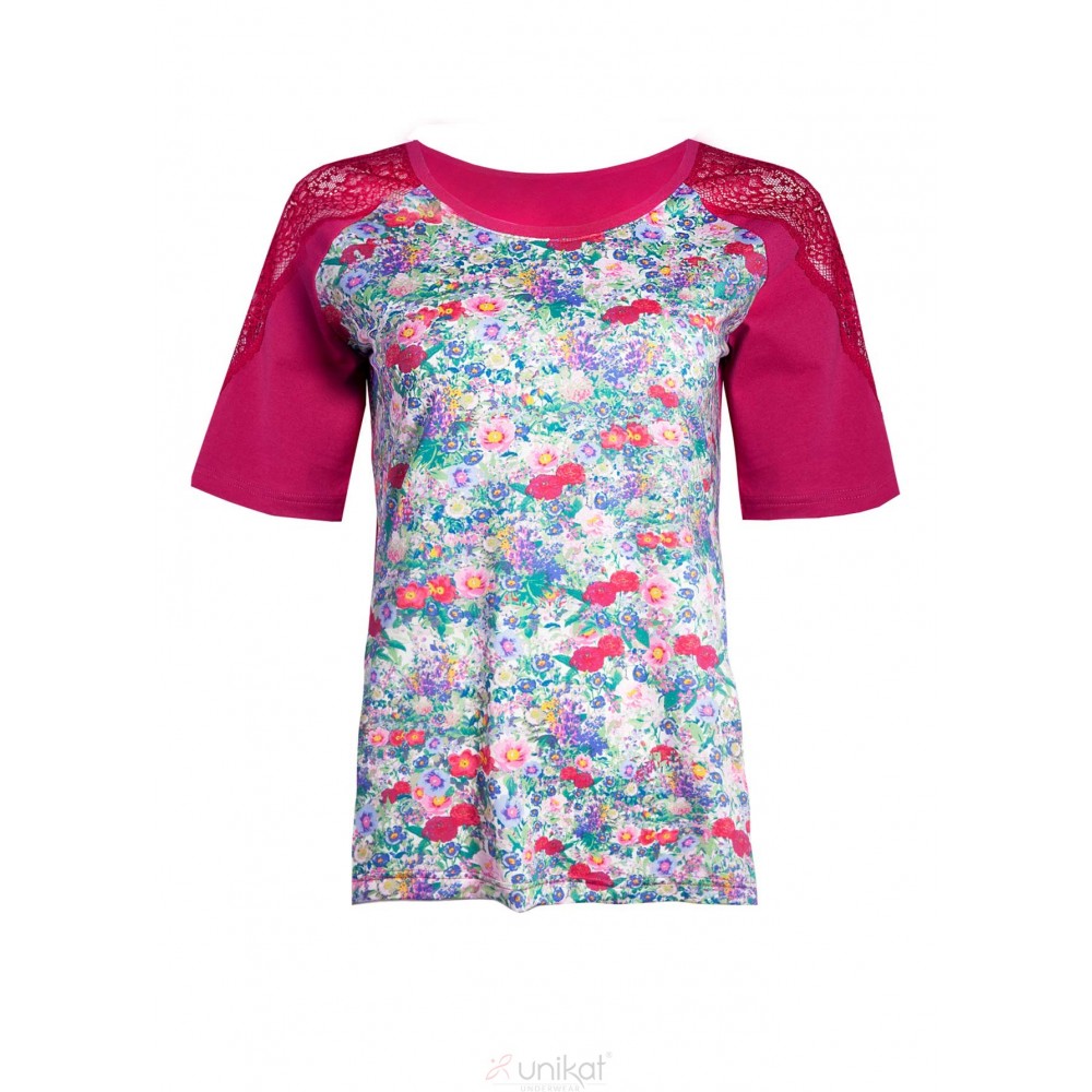 Energetyzujący, wiskozowy komplet Sija stworzony jest po to, by zapewnić przyjemny wypoczynek, gdy za oknem jest cieplej. Koszulka sprawia wrażenie, jakby rozkwitła na niej cała letnia łąka. Na ramionach umieszczone są w