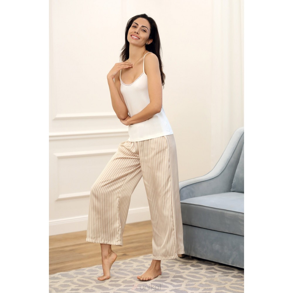 Podaruj sobie miękki dotyk za sprawą eleganckiej piżamy ALEXA, będącej połączeniem różnych materiałów. Koszulka wiskozowa na cienkich ramiączkach, wykończona w dekolcie koronką. Spodnie typu kuloty w podłużne paski, opty